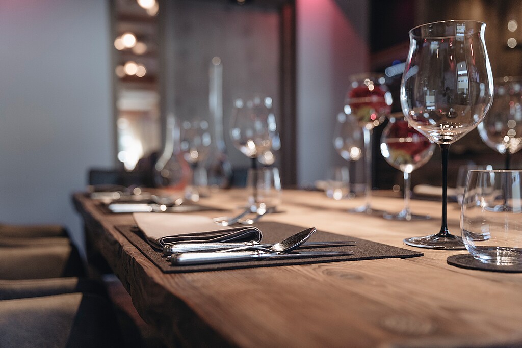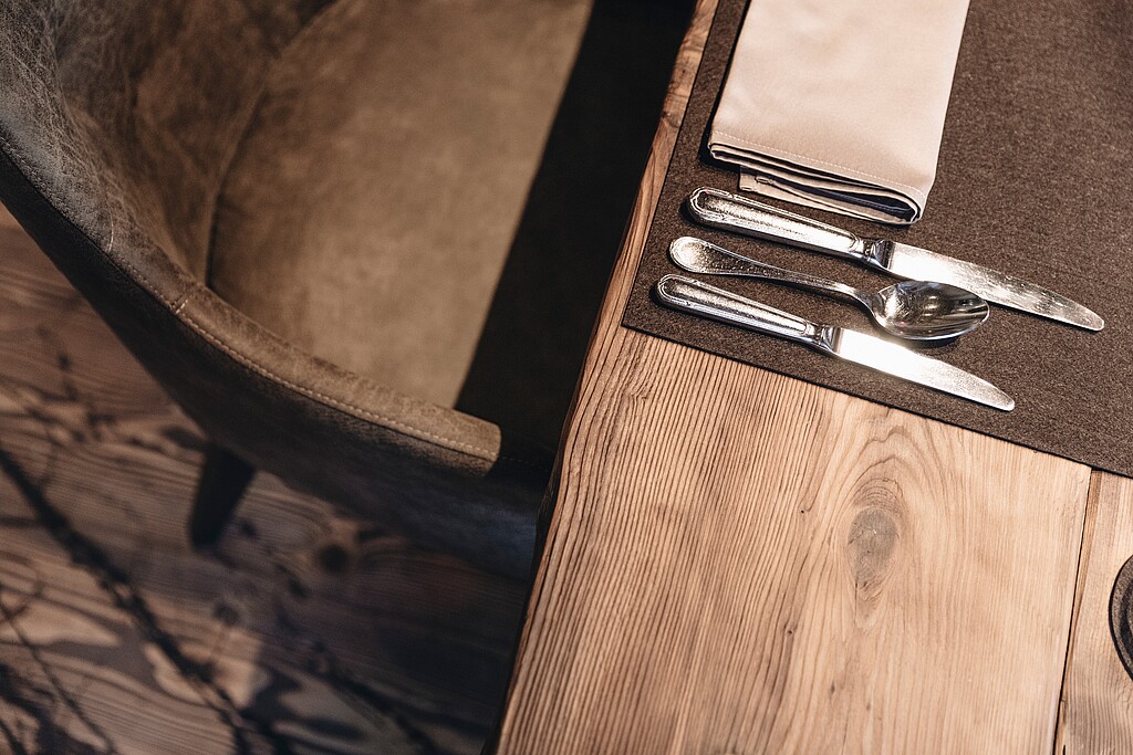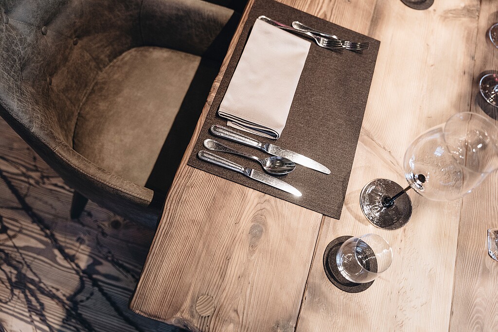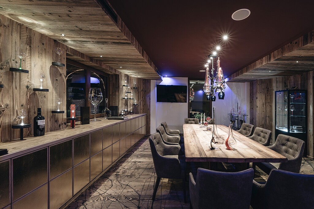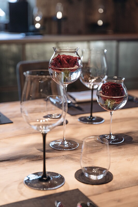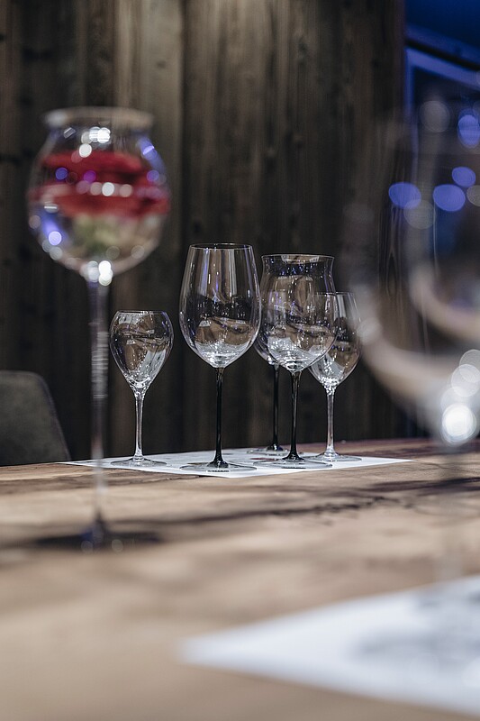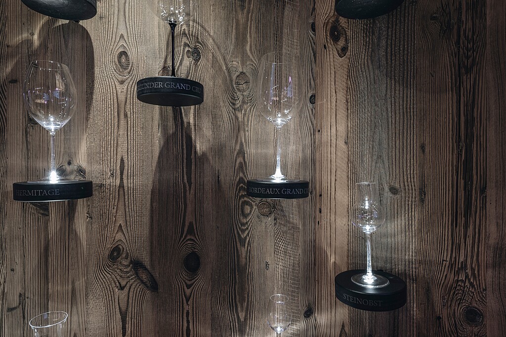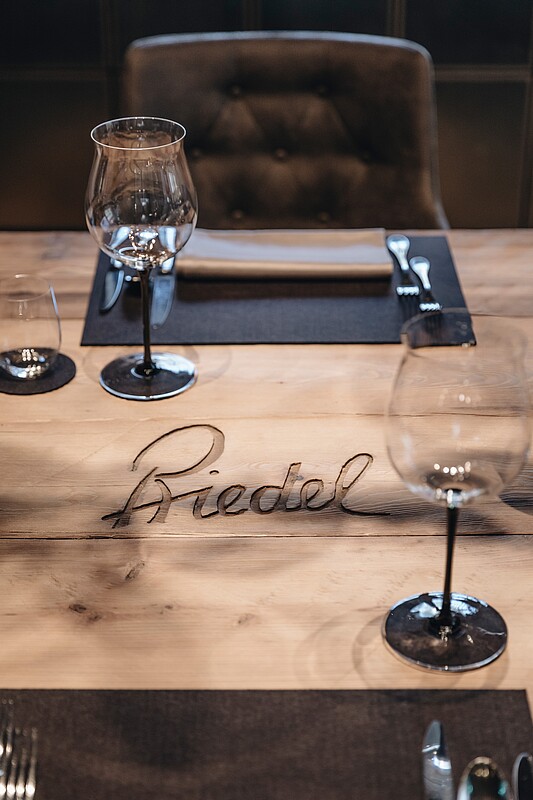 Der Genuss hat im RIEDEL ROOM@GREIL auch einen grundsoliden Boden, der die enge Verbindung mit der edlen Glasmanufaktur aus Kufstein zum Ausdruck bringt. Das Holz der Bodenbretter kommt direkt aus der Glaswerkstätte der Firma Riedel. Es ist von Brandspuren gezeichnet, die entstehen, wenn flüssiges Glas auf den Boden tropft.