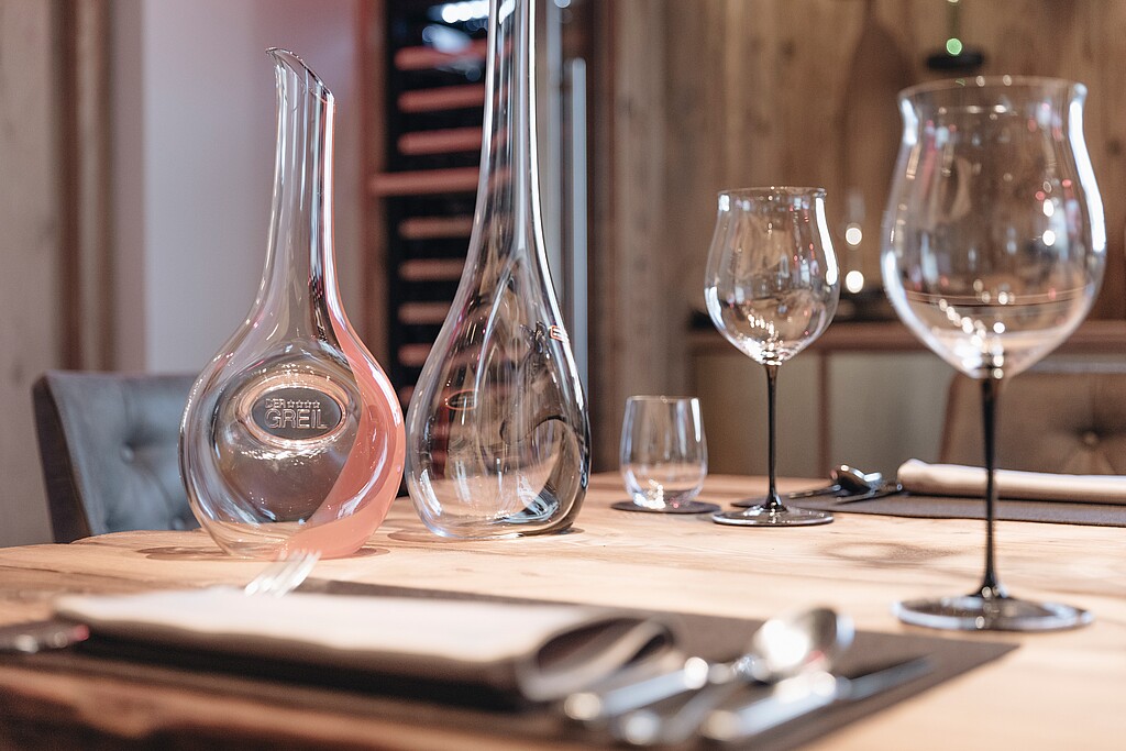 Junge Weine brauchen Luft, ältere Weine möchte man vom Depot trennen, deshalb wird jeder Wein beim Greil dekantiert. 40 originelle Riedel-Dekanter stehen bei uns im Hotel verteilt.