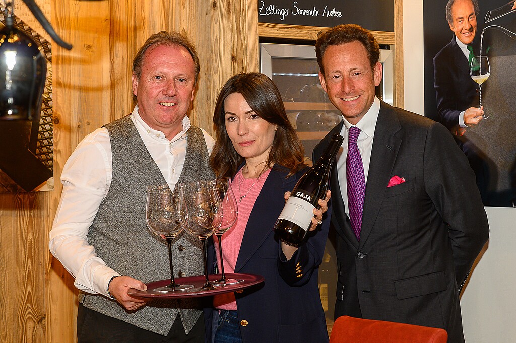 Die Firma Riedel mit Maximilian Riedel (11. Generation) und Rossana Gaja von Gaja Wein mit ihren Teams und 100 mal Riedel Glas am Riedeltisch im Riedel Room beim Greil.