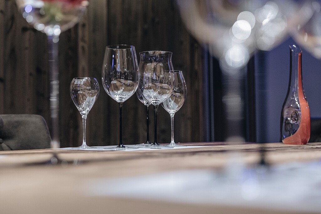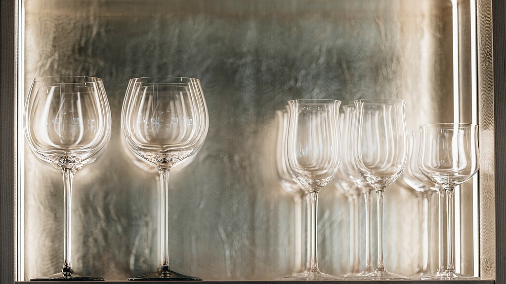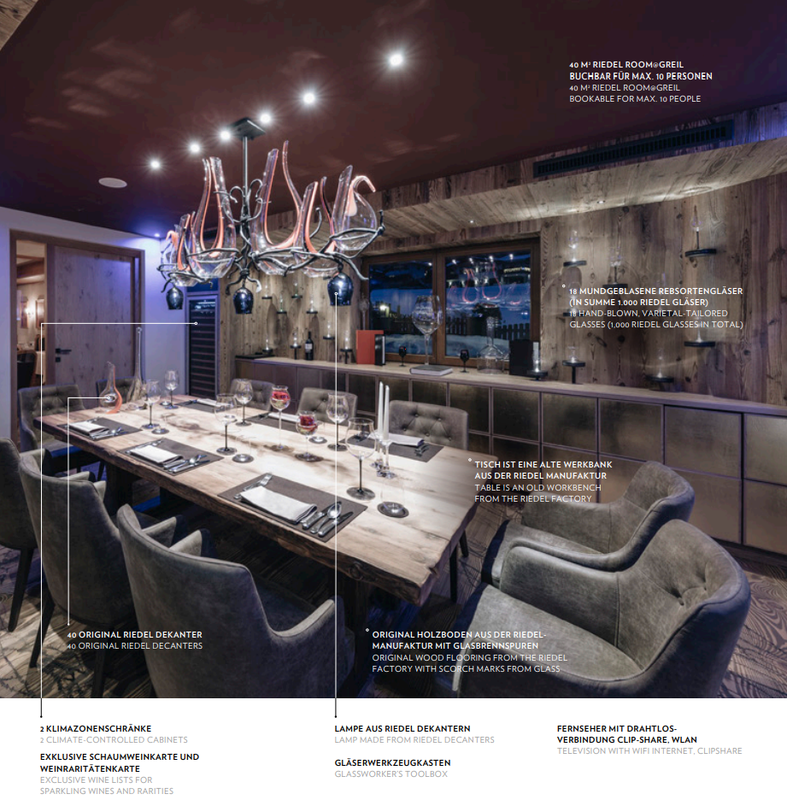 Zum guten Wein gehört das richtige Glas, und da gibt es für Sepp Greil nur eine Wahl: mundgeblasene Riedel-Gläser aus dem benachbarten Kufstein. Mit dem neuen RIEDEL ROOM@GREIL findet die Kooperation zwischen dem Weinritter Sepp Greil und dem Hersteller Rebsorten typischer Weingläser einen neuen Höhepunkt. Maximilian J. Riedel zum markanten Alleinstellungsmerkmal des neuen Raumes: „Weinliebhaber finden hier die weltweit vielfältigste Auswahl unserer Gläser!“.