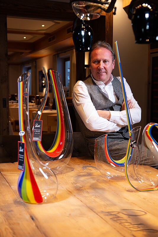Weinritter Sepp Greil, größter Fan der funktionalen Weingläser von Riedel konnte sich jedes Jahr einen der sehr begehrten, limitierten Sammlerstücke sichern und ist nun stolzer Besitzer von allen vier Dekanterndieser exklusiven Rainbow Kollektion.